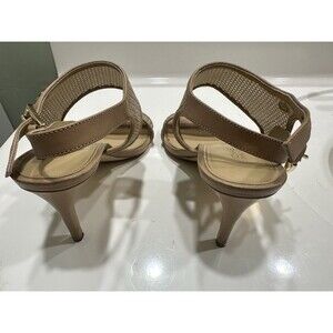 The Michael Kors Leilah Sandals in Nude, size 7.5M, are a stylish and versatile option for various occasions. With a slim ankle strap and a 3 inch high heel, these sandals provide both comfort and elegance. The open toe design, solid pattern, and buckle closure make them perfect for travel, weddings, parties, casual outings, formal events, and even workwear. Made with a combination of mesh and leather, these sandals are ideal for the summer and spring seasons, offering a chic and trendy look.