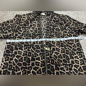 Excellent used condition. Leopard print full zip blouse. I’m not sure if it’s a design or flaw but it has a button on the sleeve, but unable to see where sleeve strap is to pull up sleeve. Other than that is perfect condition.