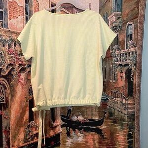 Chic light yellow top with a side tie. Short sleeves and textured fabric. Ideal for casual wear.