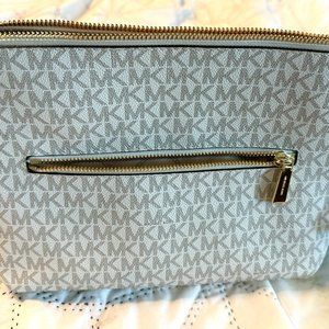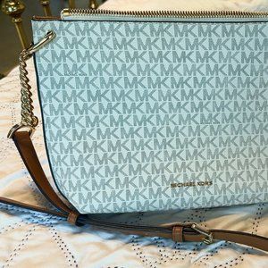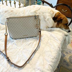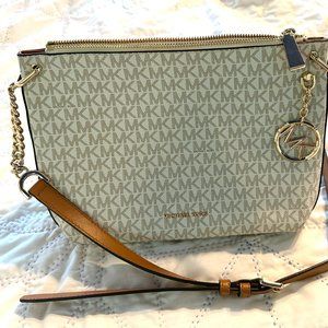 Practically new. Michael Kors shoulder bag. Vanilla MK body with Acorn Brown sides and strap and lots of blingy gold details. Has tags, but not attached.