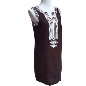 Elevate your casual look with this Michael Kors linen shift tunic dress in a rich chocolate brown color. The dress features a solid pattern, round neckline, and sleeveless design with a zip closure. The bohemian and classic theme of the dress is accentuated with embroidered details and a zipper closure.