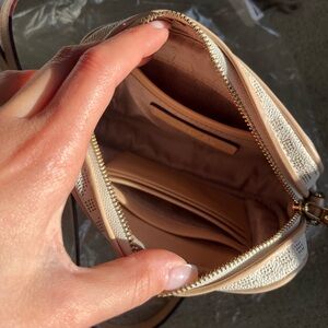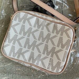 Stylish Michael Kors crossbody bag. Features signature MK pattern. Compact and chic design.