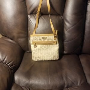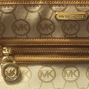 Michael Kors Logo Print Crossbody purse - measures 10" x 10".  Excellent condition, only used a couple of times.  Gold accent zipper tag and label.  Lots of pockets inside - one zipper pocket outside.