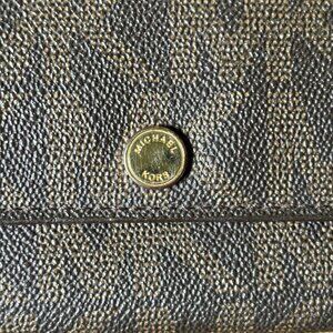 Sleek Michael Kors logo wallet with a brown exterior and red interior. It has a tri-fold design, crafted from premium leather. Features multiple card slots, checkbook holder, and change pockets for organized storage. Snap Closure