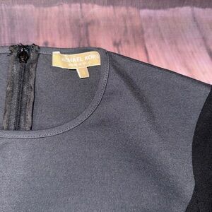 Michael Kors size 0 bodycon dress in black/graphite. High round neckline. Hidden back zip close. Body contouring color block layout & seams. Thick knit fabric with stretch. Long sleeves. Straight hem. Unlined.