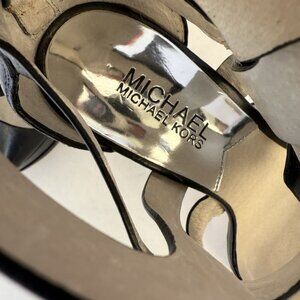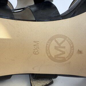 The product is a pair of Michael Kors Lucinda black leather zip back open toe heels in size 6.5 for women. These stylish strappy heels feature a mid-height heel and a zip closure for easy wear. Made from high-quality leather, these shoes are perfect for adding a touch of sophistication to any outfit.