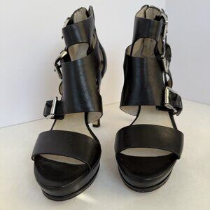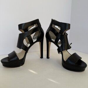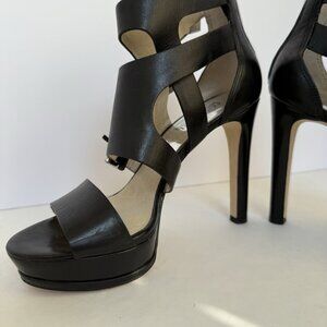 Michael Kors Lucinda Black Leather Zip Back Open Toe Heels Shoes