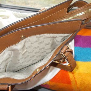 This is a brand new with tags attached, and authentic Michael Kors handbag. It's color is luggage brown , and dee dee pattern. There are two large open pockets on one side and on the other side, there are two more pockets. It comes from a pet free and smoke free home. Please email me for any questions. Thank you