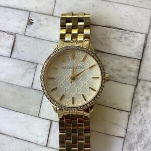 This stylish Michael Kors MK3120 women's watch features a gold dial and bezel with crystal accents, gold-tone hands, a gold-plated-stainless-steel case and bracelet.