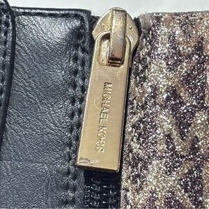 Stylish black boots with Gold Purple Glitter MK logo trim. Gold Hardware, Inside Zippers, 3/4” heel. Durable and comfortable. Perfect for any occasion this Fall Winter Season.