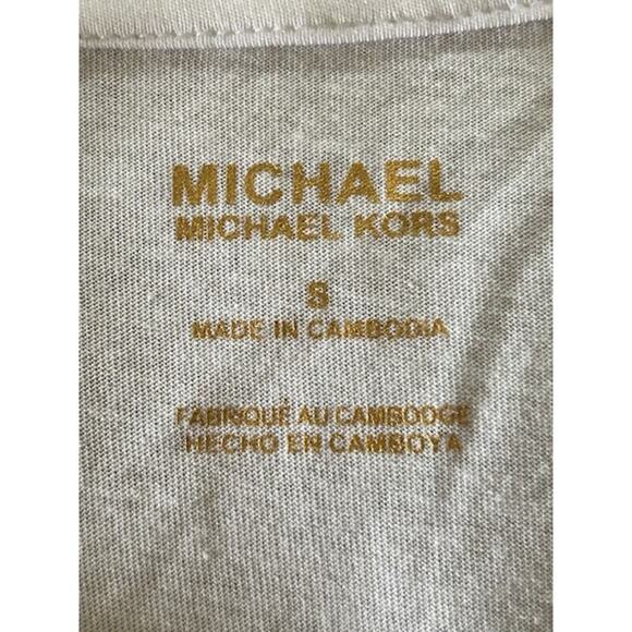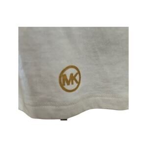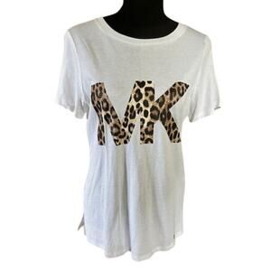 Michael Kors short sleeve tee featuring bold leopard-print MK logo on the front. Lightweight white cotton-blend shirt with a slightly relaxed fit and crew neckline. Size small. In gently worn condition.