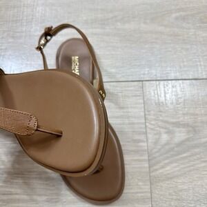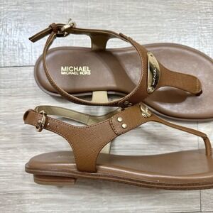 Michael Kors MK. $145 Women's size 6.5 M. Logo gold plate t-strap brown leather upper sandal. In almost new condition, has some marks and stains on the bottom.