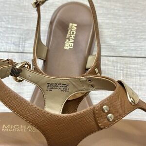 Michael Kors MK Logo Gold Plate T-Strap Brown Leather Sandal Women's Size 6.5 M