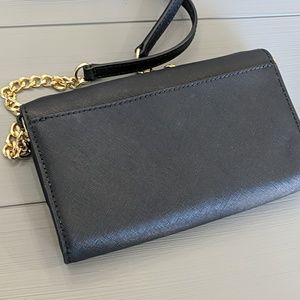 Michael Kors Leather convertible crossbody purse /clutch. Black with gold hardware and removal strap and snap closure. Interior zip pocket, 2 large open pockets, and 6 card slots. Size 5H x 7 3/4L. Only used once, looks brand new. Smoke free /pet free home.