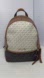 Michael Kors backpack with iconic MK design. Features tan and white color scheme. Perfect for everyday use.