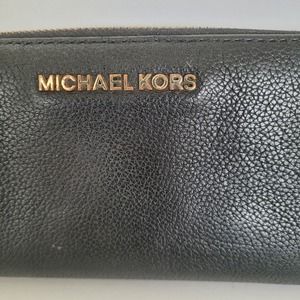 Michael Kors MK Zip Around Wallet Clutch Black 8x4 Large Logo Pebble Leather