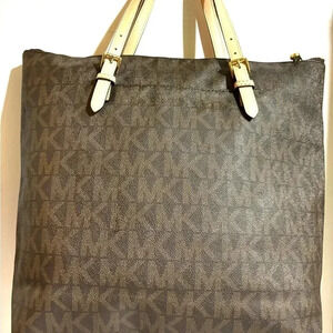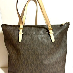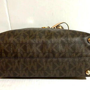 Michael Kors MK signature print canvas hobo handbag with gold tone hardware main compartment 5 pockets at interior wall 1 zip closure fabric lining leather strap and trim hangtag at front lining have some stains exterior snap pocket at back hight13.5” wide 16.5” depth 5” strap drop 7”The dimensions are based on approximately measurements before placing an order please check take a moment to view all photos using feature for a closer look The dimensions are based on approximately measurements before placing an order please check take a moment to view all photos using feature for a closer look