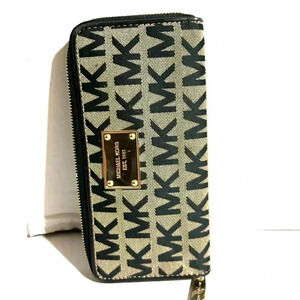 Michael Kors MK signature print canvas wallet with gold tone hardware main compartment gold, metallic leather lining 4 cash compartment 10 card slot lining have some peeling zip closure at top logo at front minor scratches black leather trim hight 4” wide 8” depth 1”The dimensions are based on approximately measurements before placing an order please check take a moment to view all photos using feature for a closer look