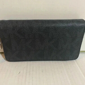 Michael Kors MK signature print canvas fabric wristlet/ wallet with silver tone hardware plenty of compartment logo at front zip Closure at front hardware have some tarnishing hight 4” width 7” depth 1” wallet dimensions are based on approximate measurements before placing an order please take a moment to view all photos using feature for a closer look