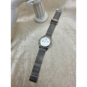 This Michael Kors MK5076 Runway watch features a sleek silver dial, stainless steel chronograph, and timeless design, perfect for any occasion. has a couple of small scratches on the face, band has been replaced wit a slide adjustable stainless steel band, working