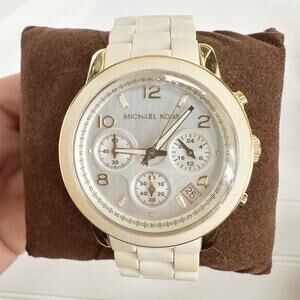 The Michael Kors MK5145 is a bestselling chronograph watch featuring a glossy white finish with polished stainless steel accents for a clean, modern look. Designed with a multifunction chronograph dial, date window, and classic three-hand movement, this style blends sporty functionality with signature Michael Kors glamour. The versatile white colorway pairs effortlessly with everyday outfits, workwear, and casual looks. A chic, durable timepiece known for its elevated design and wear-anywhere appeal.