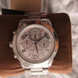Stainless steel case and band with original box and manual. Has been sized down, but comes with all links. Any jeweler can resize for you. :)