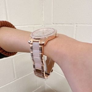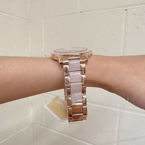 Michael Kors MK6928 Tibby Multifunction Multicolor-Tone Stainless Steel Watch Case Size: 40MM Movement: Multifunction Platform: TIBBY Strap Material: Stainless Steel Water Resistance: 5 ATM Case Material: Stainless Steel Case Color: Rose Gold Dial Color: Pink Strap Width: 20MM Closure: Bracelet Deployant Strap Inner Circumference: 175+/- 5MM Battery Type: SR621SW
