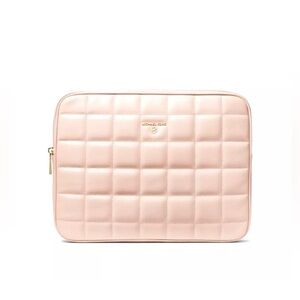 This Michael Kors sleeve case is the perfect accessory for your MacBook Pro 13" or iPad Pro. The quilted leather design adds a touch of luxury and sophistication, while the pink color gives it a fun and playful vibe. The case is specifically designed to fit 13" laptops and under. The leather material is durable and will keep your device safe from scratches and bumps. Whether you're heading to work or traveling, this Michael Kors sleeve case will ensure your device stays protected and stylish. Its compact size makes it easy to carry around, and the sleeve design allows for quick and easy access to your device. Add this beautiful case to your collection today!