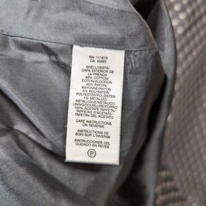Great looking jacket in good condition. Black fabric has subtle grid with silver dots that pick up the light at different angles jacket has three large button closures in a snap .sleeves are three-quarter length Raglan. Jacket is fully lined and there are no pockets. The shape is slightly belled.