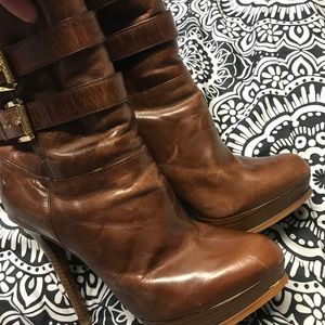 Sleek straps and shining, goldtone roller buckles distinguish a chic, distressed leather platform boot perched on a towering heel. A faux-shearling-lined shaft can be worn up to keep your legs cozy or folded down for a more stylish effect.