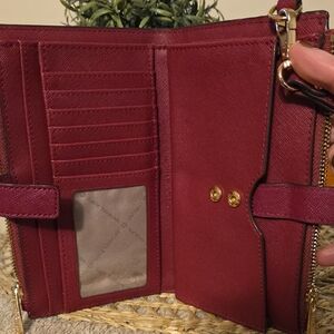 Stylish Michael Kors wallet with wristlet in vibrant magenta. Perfect for essentials. Sleek and elegant design.