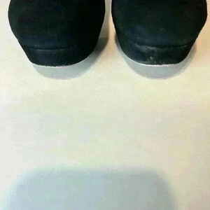 4-3/10" covered black heel, 1" cover platform. Suede upper with rubber sole.