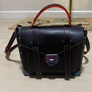Chic black satchel with vibrant multicolor accents. Eye-catching design. Ideal for everyday use.