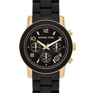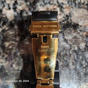Telling more than just time, this gorgeous MK Runway chronograph watch (38mm) is ready for its next chapter! Features a sleek black silicone band, gold-tone stainless steel case, and chronograph display - perfect for counting down the minutes until your next adventure. It was a gift drom me ex, but like my dating history, this watch is gently used but still absolutely fabulous. Pairs perfectly with everything from joggers to party dresses (and unlike my ex, it actually shows up on time! ๐). Please check the photos carefully...I think there is a tiny scratch on the face, but too small for me to tell.