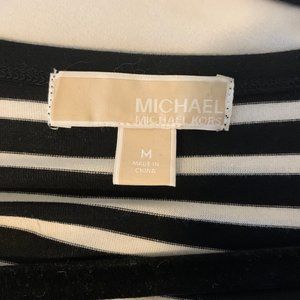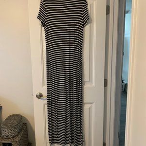 Gently worn Michael Kors maxi dress in black and white stripes. Short sleeves and an open crewneck make it look like a long t-shirt dress. There are side slits on both sides to make movement easy. Unlined and super comfortable, this dress is great for summer! From a smoke and pet free home.