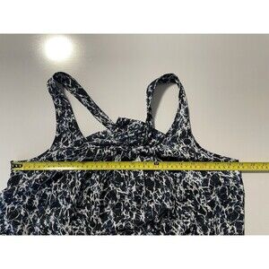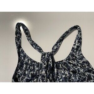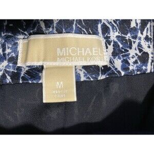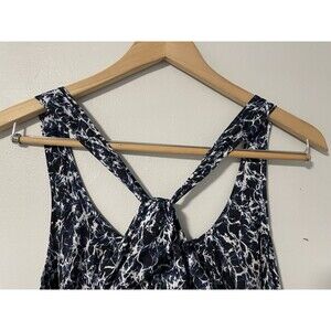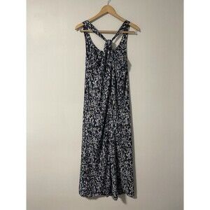 This Michael Kors sleeveless maxi dress in size M features a pleated round neckline, straps that cross in the back and in a blue/black/white print that resembles and expressionist painting. It has pockets and is made of polyester, suitable for casual occasions. The dress is long in length, making it a stylish choice for women's clothing. Approximately 56" long, 19" from pit to pit.