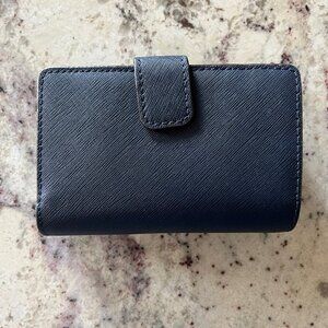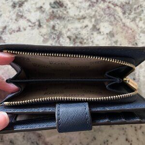 Michael Kors wallet in good condition. Navy and holds multiple cards. Has room for cash and coins. Stain on the inside where cash goes.