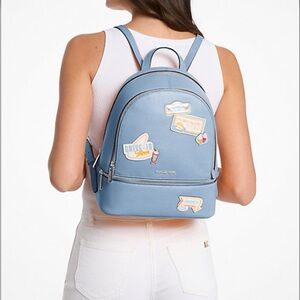 Chic light blue backpack featuring playful patches. Ideal for a stylish, casual look.