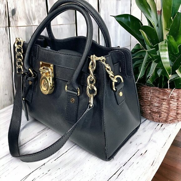 A handsome black textured leather Hamilton satchel by Micheal Kors. Features include-medium size, shiny gold hardware, snap closure, crossbody strap and dual rolled leather handles, lock and key in front. Very good preowned condition, light cosmetic wear to the wax seal at the corners. See photos for more details. Happy to answer any questions!