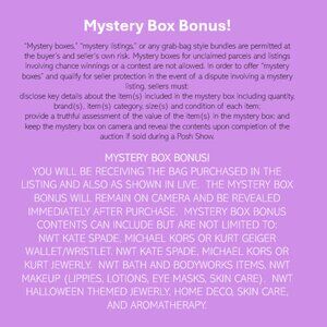 YOU WILL BE RECEIVING THE BAG PURCHASED IN THE LISTING AND ALSO AS SHOWN IN LIVE. THE MYSTERY BOX BONUS WILL REMAIN ON CAMERA AND BE REVEALED IMMEDIATELY AFTER PURCHASE. MYSTERY BOX BONUS CONTENTS CAN INCLUDE BUT ARE NOT LIMITED TO: