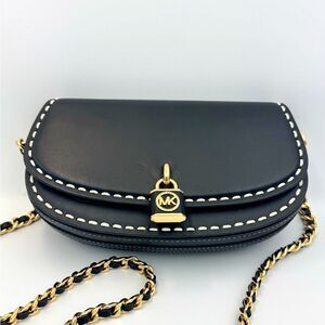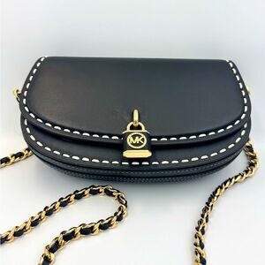 Preloved, used once This bag is in pristine condition, with only a minor flaw on the inside near the closing snap at the bottom. Accented with contrast stitching and a logo lock charm, this leather accessory by MICHAEL Michael Kors is a wardrobe staple you'll reach for time and time again.