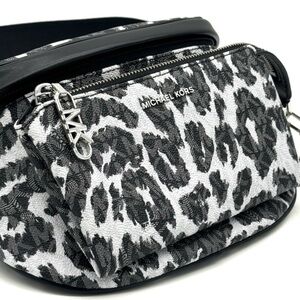 Michael Kors® Slater Medium Sling Pack! Crafted from durable polyvinyl chloride with a sleek polyester lining, this versatile accessory boasts a trendy cheetah distortion MK signature.