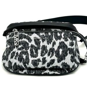 Michael Kors® Slater Medium Sling Pack! Crafted from durable polyvinyl chloride with a sleek polyester lining, this versatile accessory boasts a trendy cheetah distortion MK signature.