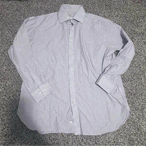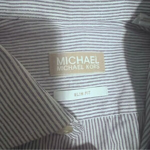 Elevate your style with this Michael Kors men's button-down shirt. The purple striped pattern and collared neckline provide a classic look that is perfect for any occasion. The long sleeves and button-down closure make it a versatile addition to your wardrobe, while the regular fit ensures comfort and style.