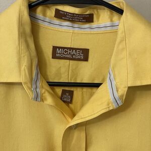 Elevate your formal look with this Michael Kors men's dress shirt. The shirt is made of 100% cotton and features a collared neckline with a tab style and long sleeves with barrel cuffs. The shirt has a button closure and comes in a vibrant yellow color, making it perfect for weddings, parties, christenings, and other formal occasions. It also has a breast pocket for added convenience.