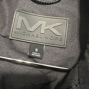 This is a listing for a preowned Michael Kors Men's Grey Soft Shell Nylon Jacket in Size Small. It is in very good condition with minimal wear. The measurements are in the photos. Please see all photos for details, as they are part of the description.