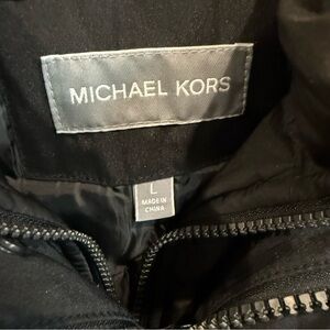 Michael Kors Men's Hooded Snorkel Coat With Excellent used condition. No marks or stains. No rips or wear. One exception a snap cover is missing. (Price reflects this flaw) Removable Faux Fur Hood Trim. Versatile coat. Good for every day. Color: Black Men’s size: Large Warm, stylish, comfortable, quality jacket. Stand collar with attached faux-fur trim hood; attached quilted bib Zipper and button closures at front Two zip pockets at chest; two flap pockets at hips; interior pocket Adjustable cuffs Lined; insulated 20 degree warmth factor Water resistant; heavyweight Shell: polyester/cotton; body, sleeve lining and insulation: polyester; faux-fur: acrylic/polyester Machine washable Non-smoking household Bundle and save.