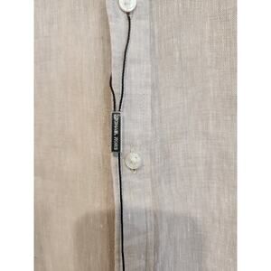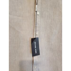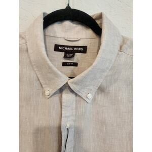 The product is a stylish and classic Michael Kors Men's Linen Shirt in XL size, featuring a slim fit design that is perfect for a slimming look. Made from high-quality linen material, this short sleeve button-up shirt in beige color is versatile and perfect for a casual yet put-together outfit. The renowned brand's attention to detail and quality craftsmanship make this shirt a must-have addition to any man's wardrobe.