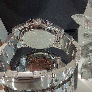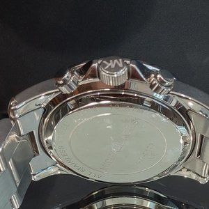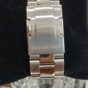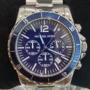 NWT. This classic Michael Kors analog chronograph watch for men features a two-toned silver and blue stainless steel case (45mm diameter and 14mm thickness) and silver-toned band (24mm width). Silver colored dial hands and Arabic numerals against a blue face. Scratch-resistant mineral dial window. Watch has analog display including 3 sub-dials (hours minutes seconds) and date display. Water resistant up to 100 meters. Comes with FREE Gift Box. Needs Battery.