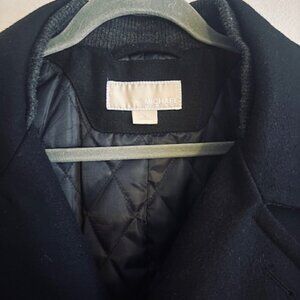 Elevate your winter wardrobe with this stylish Michael Kors pea coat jacket. The black wool blend outer shell material is accented with a stand-up collar and button accents. The mid-length jacket features a zip closure and pockets for convenience.